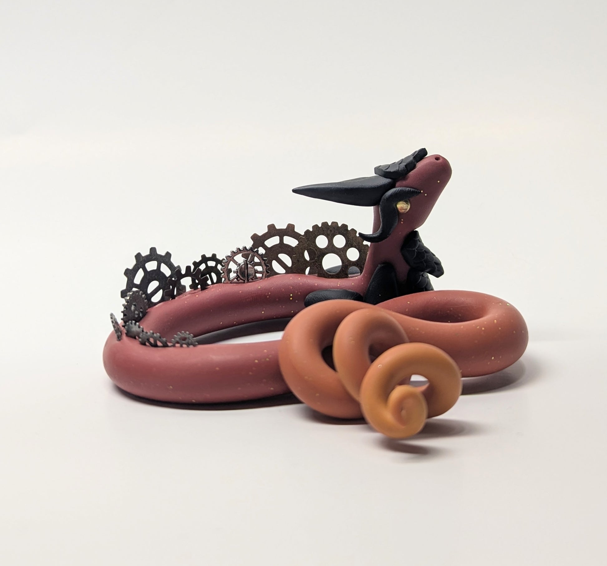 Unlock the fantasy world with this steampunk dragon. Created with a custom blend that started with a warm red that transitions to orange and finally yellow. With a little bit of sparkle through out the body of the dragon.